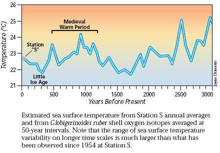 This leads to a direct temperature record of the surface of the Sargasso Sea for the last 3000 years in high resolution form. Because it deposits its calcium carbonate close to the oxygen isotopic equilibrium and that this equilibrium is temperature-sensitive, such a record can have an actual temperature assigned to it to good accuracy, as the figure below illustrates: