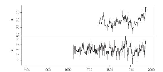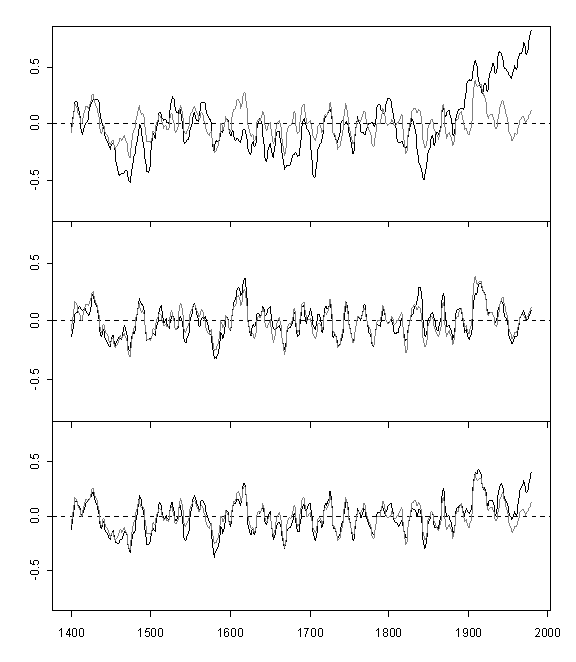 MM05a Figure 3. PC1s from the MBH98 15th century NOAMER network: top – MBH and bottom – princomp.