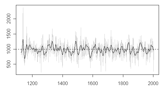 Actually, what I would rather see, sans bristlecones of course, would be a reconstruction with tracking. I.e. an attempt to track the non-stationarity of the data. Is the degree of non-stationarity > 1 and therefore not trackable? Or do the other proxies have enough stationarity that they could be tracked? I haven’t run any numbers but I bet a windowed sample variance would be rather erratic over time.