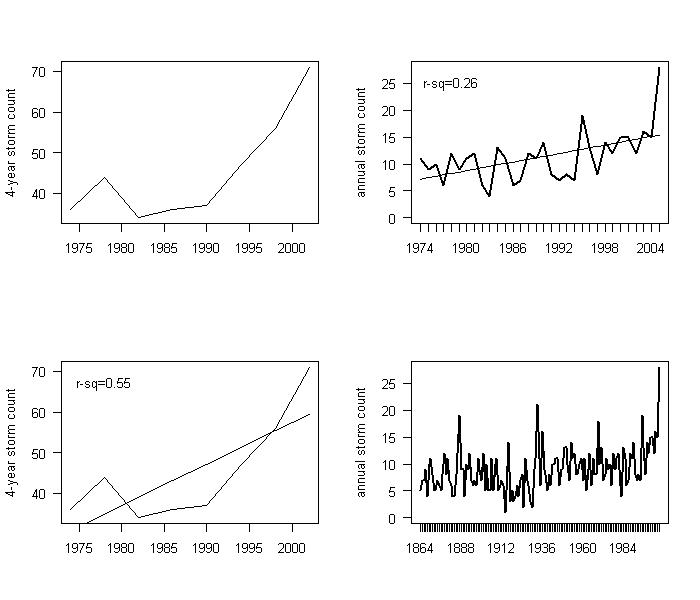 Over the next few years we are going to observe a certain number of category 1,2,…,5 North Atlantic hurricanes. It might be fun to set up a “shoot-out” between the Emanuel and Gray models, a testable hypothesis with specific critical values so that at the end of some time interval — depending on how many hurricanes of which categories — we could decide whether the Emanuel hypothothesis or the Gray hypothesis provides a better description.