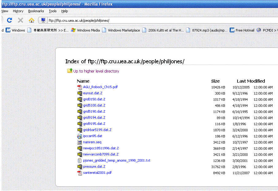 Here’s a theory: People at CRU were being sloppy and storing things they aren’t supposed to store on the public ftp site. (Example: the pdf file for chapter 15 of Robok. The publisher might be displeased to see a copy freely available on the web.)