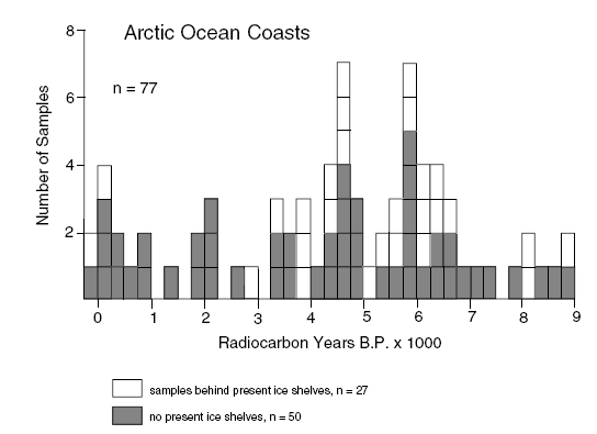 Sadlov, I don’t think anyone would be surprised if “much of the ice shelf out there is not as old…” I rather strongly suspect – without adequate evidence – that most of the Ellesmere ice shelf that broke up over the last century dated from the LIA.