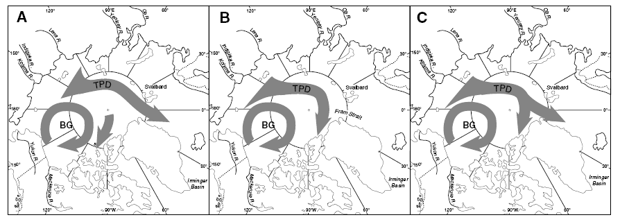 Dyke et al hypothesize that the terminus of the Trans-Polar Drift has varied considerably through the Holocene. In one extreme, the Trans-Polar Drift exits the Arctic in the Fram Strait east of Greenland and delivers little or no driftwood to the Canadian Archipelago; in another extreme, the Trans-Polar Drift turns west and delivers driftwood to the archipelago.