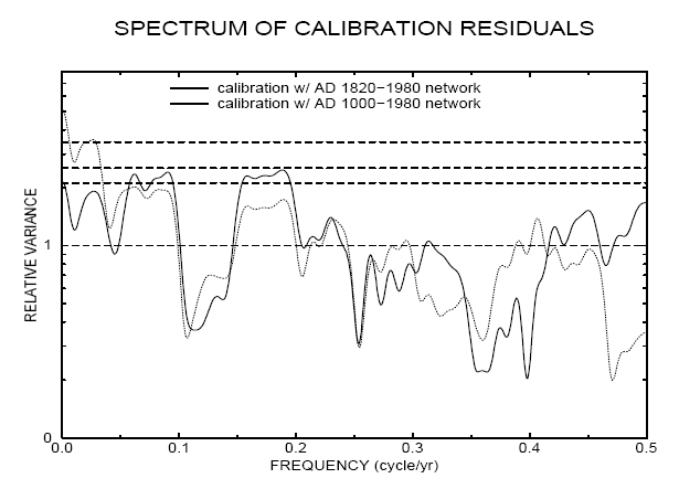 Jean S has observed that the MBH99 preprint (but not the final version) contained a graphic of the spectrum of residuals for the AD1820 and AD1000 networks (though as noted below, this may not be correct. Jean S’ digitization of the residuals is here AD1000 AD1820 . He used the Matlab routine for calculating MTM spectra script here , digital versions of spectra here AD1000 AD1820 . His emulation of MBH99 Figure 2 is here.