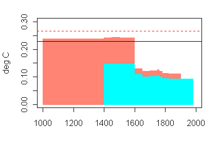 I then looked at the file that I have been using for the uncertainties associated with MBH99 (see attachment), which I must have got from you some time ago. Column 1 is year, 2 is the “raw” standard error, 3 is 2*SE. But what are columns 4 and 5? I’ve been plotting column 4, labelled “1 sig (lowf)” when plotted your smoothed reconstruction, assuming that this is the error appropriate to low-pass filtered data. I’d also assumed that the last column “1 sig (highf)” was appropriate to high-pass filtered data. I also noticed that the sum of the squared high and low errors equalled the square of the raw error, which is nice.