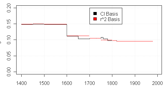 A similar situation arises with the period from 1750-1800. The r2 information shows 3 steps in this period, but the CI information shows one step. Did the CI calculation not use all the actual steps? Or were there different runs? Again, it’s impossible to tell. It’s the Hockey Team. There’s an odd little wrinkle in the 15th century, with an extra little unexpected bump as well.