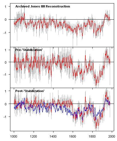 I’ve posted on the other two Jones et al 11th century proxies – Briffa’ s Polar Urals and Tornetrask series -at length here – look at the Jones et al 1998 Category on the right. There’s nothing presented here that doesn’t apply to them. If anything, they have their only little tweaks to "improve" the hockey stick – little "adjustments" showing the handwork of master artisans. A connoisseur should be able to identify a Jones-type series by its craftsmanship, which differs from Mannian craftsmanship: a long featureless MWP; centennial variation initiating in the LIA; modern values squeaking out a bit higher than the MWP.