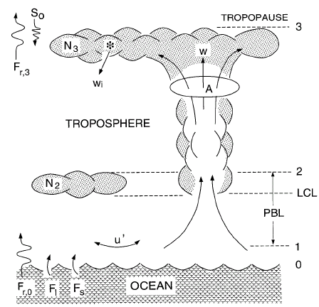 Original Caption: The surface, the top of the air-sea interfacial layer, the top of the low clouds, and the tropopause. Because of the shallowness of the low clouds, no distinction in height is made between level 2 and the LCL. Variables with a numerical subscript indicate global means at the respective level, which may differ from their values in the updrafts. The symbols A, N2, N3 indicate fractional areas occupied by the deep updrafts, the low, and high clouds, respectively; u9 is the turbulent wind velocity at level 1; and w and wi are the vertical velocities of the deep updrafts and the settling ice (both taken as positive), respectively.