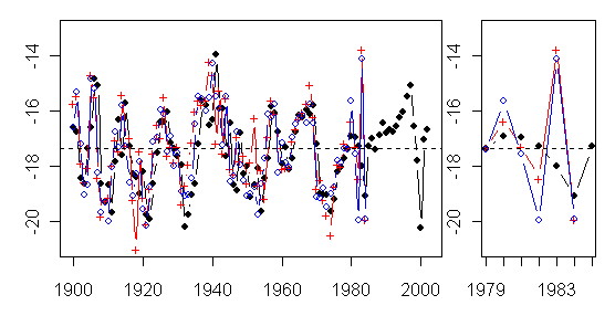 Maybe it’s just me, but I have trouble discerning a strong 20th century trend in this data. If I didn’t know that this data seet was suppsoed to end two sigmas on the hot side, I’d also be inclined to say that the last few years of the record end up pretty close to the average value. Yes, there was a strong El Nino reflected in elevated 1997 values, but it looks like there was strong El Nino in 1941 or so as well.