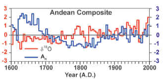 The isotope data are interesting, but the graphs so compressed it is very difficult to say very much about them. Leaving aside questions of methodology with respect to data handling I would suggest that there are no distinct trends observable in the Andean glaciers. Huascaran shows a pronounced period of light precipitation prior to 1750, from which there was a sharp increase over a period of 20 or 30 years to compositions that have persisted to the present day with no apparent trend in composition. Sajama shows no apparent trend over the past 4 hundred years. Quelccaya shows a slight upward trend towards increasingle enriched delat 18-O compositions in the 19th and 20th centuries. I did a quick correlation between the z-scores for the 5 year average isotope composition for Quelccaya, Huscaran and Sajama, with correlation coefficients of +0.12 between Quelccaya and Huascaran and +0.02 between Quelccaya and Sajama. I guess all this confirms is that the Sajama data set looks random with no trends and the Huascaran dta set is random with two regions: one before 1700 and one after 1700. The only trending data is Quelccaya, and it is weak at that.