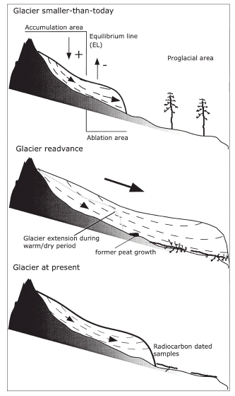 As the present glaciers can be considered as the decaying remnants of larger “ÅLittle Ice Age’ glaciers, at least partial reworking of our samples during that advance is likely. Final delivery of the samples to the glacier forefield, however, occurred only with the 1979–91 readvance and subsequent retreat.