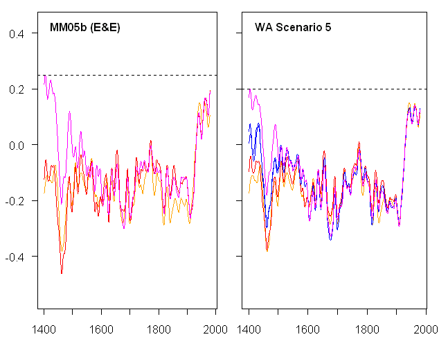 Left: Archived results from MM05 (EE) Figure 1. Orange- MBH98 as archived; red — MM05b emulation of MBH98; magenta — using 2 covariance PCs from NOAMER network. All smoothed. In addition, MM05b reported that 15th century results using correlation PCs were “about halfway” between the results with 2 covariance PCs and that “MNH-type” results occur if the network is expanded to 5 PCs. Right – WA benchmark and Scenario 5 cases using MBH98 weights and temperature PCs (after fully reconciling calculations to WA benchmark with no weights and WA version of temperature PCs). Orange — MBH98 as archived; red- WA benchmark varied as described; magenta — using two covariance PCs; blue — one graph with 4 covariance PCs; one graph with 2 correlation PCs.