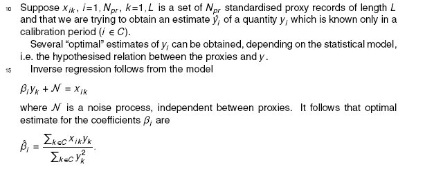 The paper does point to apparent inherent problem with inverse regression in reconstructions measuring the full range of past temperature variations e.g. Mann et al. (1999). They then point to a paper by Mann et al. that tends to refute this and leave it as an open issue. They apparently have moved on to CVM but in my view without reasonable a priori justifications for the proxy selections and without (at least to my point of reading) a reasonable explanation for the lack of correlation of proxy response to local grid cell temperatures.