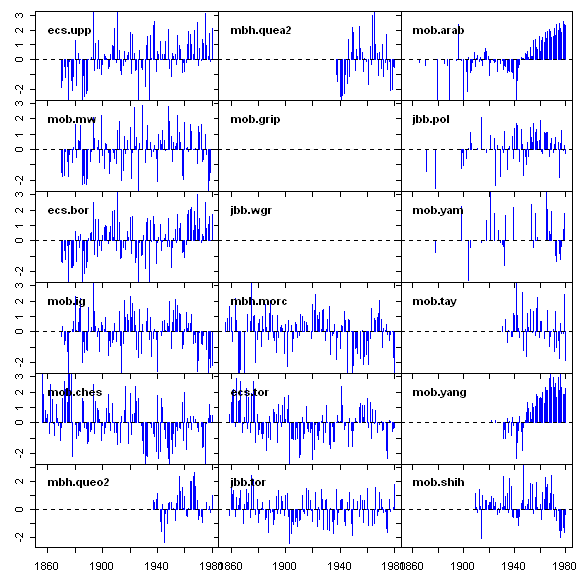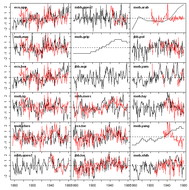 I thought that some of you would be interested in a plot of Juckes’ Union proxies against gridcell temperatures. I’ll start off by simply showing a plot during the 1856-1980 calibration period (both scaled over 1856-1980), as below, followed by a plot of the residuals. The proxies are arranged according to longitude from California going east to China, going down columns first. The prefix in each legend is the multiproxy source; the suffix is a short version of the proxy.