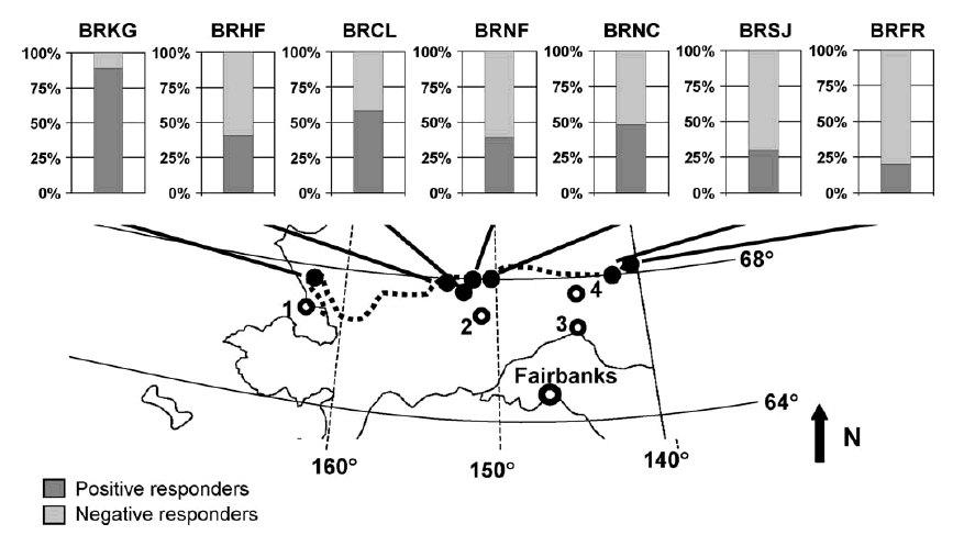 Wilmking et al. carried out a comprehensive sampling of 1558 white spruce trees at 13 treeline sites in the Brooks Range and Alaska Range. The date of the sampling is not stated but seems to be between 2000 and 2003 and includes the warm 1990s. These findings cover the same species as were primarily used in Jacoby and d’Arrigo’s northern treeline temperature reconstruction, used in multiproxy reconstructions Jones et al [1998], Jones and Mann [2004] as well as MBH98. They found that 40% of the trees had a negative growth response to increased temperatures, 36% had a positive response and the balance had no significant response. They state: