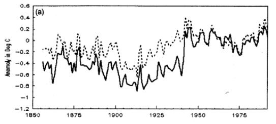Original Caption: Folland and Parker [1995] Figure 3. Annual anomalies from a 1951-80 average of uncorrected SST (solid) and corrected NMAT (dashed) for (a) northern (b) southern hemisphere, 1856-1992. Only collocated 5 deg. x 5 deg. SST and NMAT values were used.