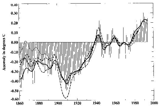 Original Caption: Parker et al. [Clim Chg 1995] Fig. 14. Global anomalies of SST, after Folland et al. (1984) (light continuous smoothed curve), after Bottomley et al. (1990) (dashed smoothed curve) and using MOHSST6 with Folland and Parker (1995) corrections (heavy continuous smoothed curve and annual bars). The dash-dot smoothed curve is NMAT, from the present analysis. Smoothing as Figure 9. Reference period is 1951-80. See here.)