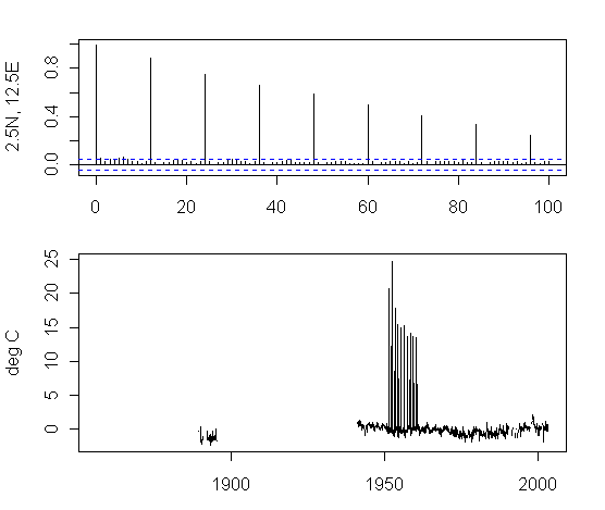 I tested some cells which were outliers under the ARMA(1,1) model. Here’s the result of the first cell that I looked at: the top panel shows the ACF – which has an unusual structure to say the least. The temperature anomaly plot is shown in the second panel and is also unusual to say the least.