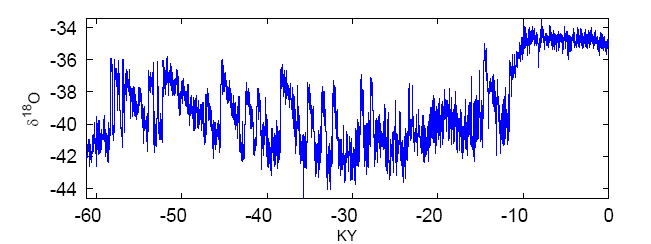 Wunsch Caption: Figure 1: àŽàⲱ8O from the GISP2 ice core as measured in the Quaternary Research Laboratory, U. of Washington (Stuiver and Grootes, 2000). Note that time runs from left to right in the physics convention. The ratio of 18O to 16O concentrations is believed to track local atmospheric temperatures in central Greenland to within an approximate factor of two (e.g., Landais et al., 2004). Large positive spikes are called Dansgaard-Oeschger (D-O) events and are correlated with abrupt warmings– measured independently in some cases. Note in particular, the quiescence of the Holocene interval (approximately the last 10,000 years) relative to the preceding glacial period. The Holocene coincides with the removal of the Laurentide and Fennoscandian ice sheets. Age model is by layer counting back to about 30,000 years and is model-based prior to that time. The range of excursion is believed to correspond to about 15à⣃”¬’à⥃.