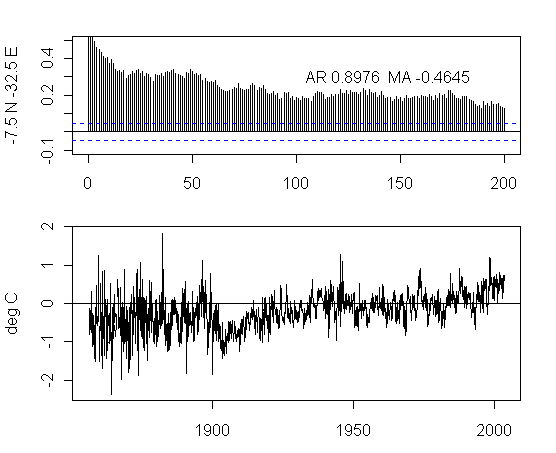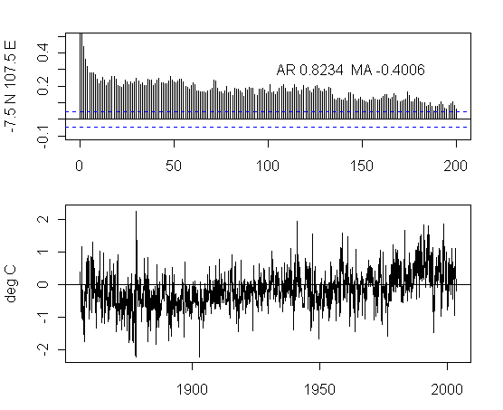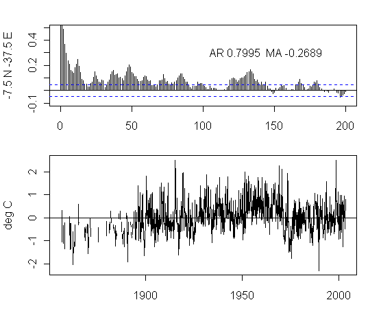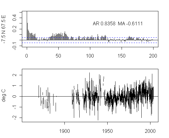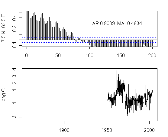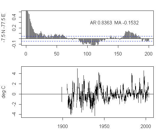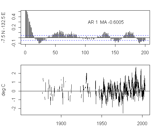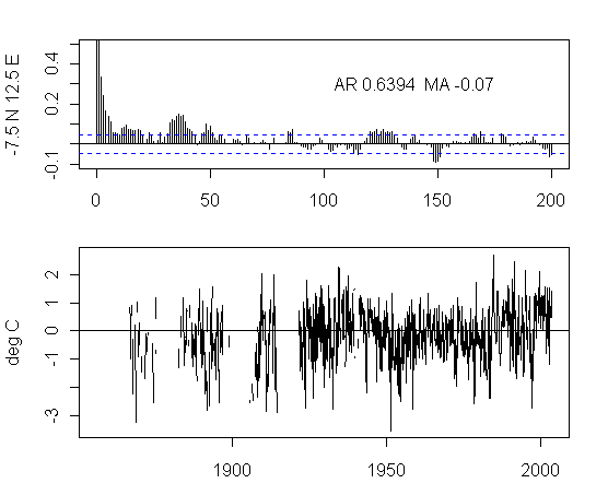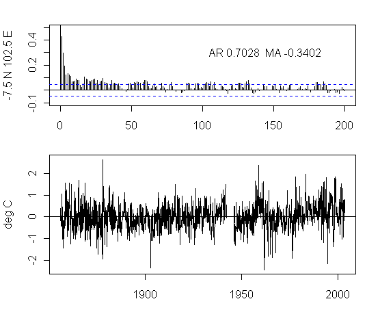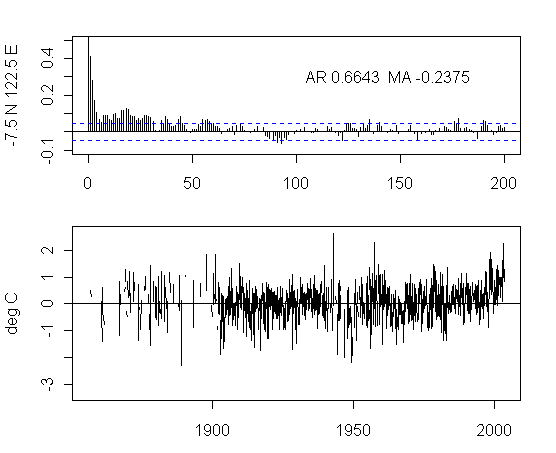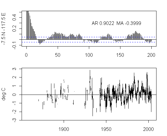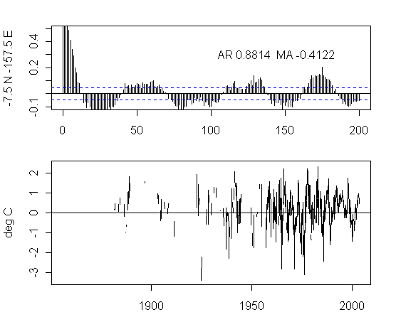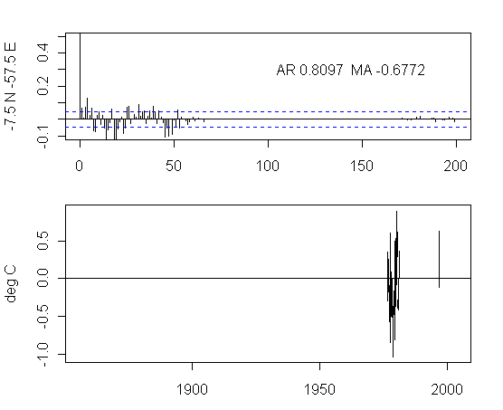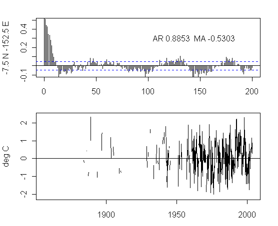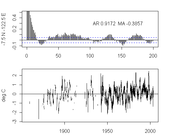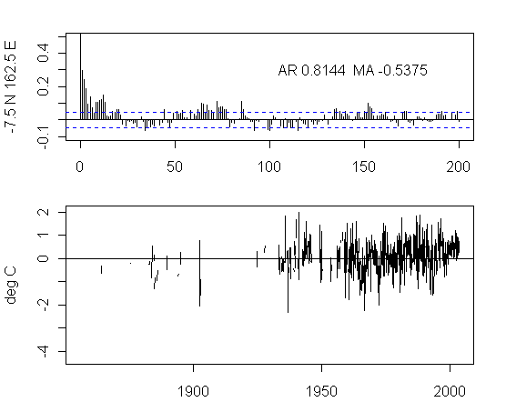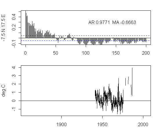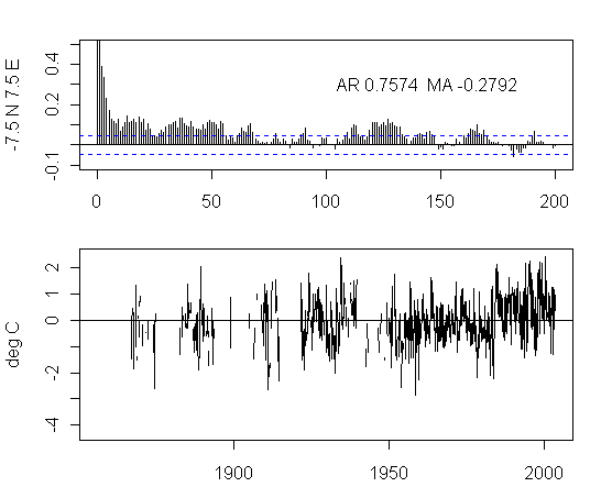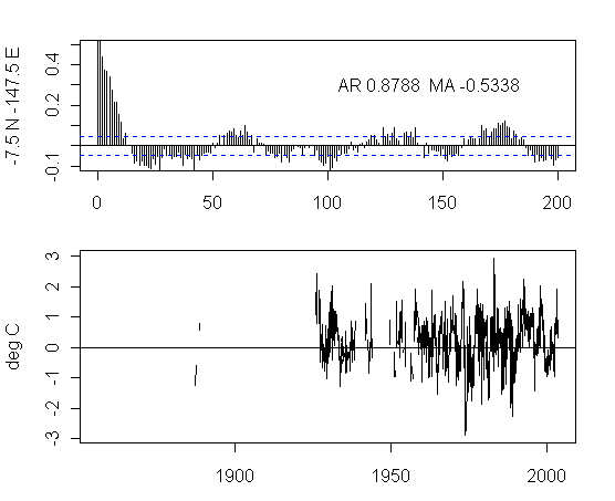 I think that there is too much preoccupation in the analysis of NH urban gridcells. As an exercise, I plotted the ACFs and gridcells for a transect at 7.5S from 177.5W to 177.5E. The presentation here is not very pretty but I think that the graphs are interesting taken as a whole. I draw no conclusions, other than it’s quite puzzling to see the difference between the patterns in adjacent gridcells and one would like to see some detailed analysis justifying the details.
