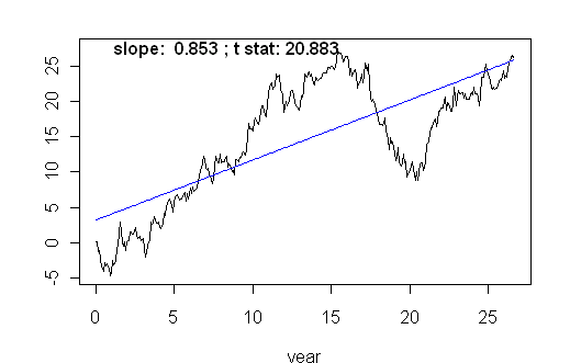 Granger and Newbold[1974] was written in 1974 and has spawned much work which I’ve promised to discuss and gradually am getting to. One of the main strategies for analyzing spurious relationships is focusing on benchmarks for the t-statistics, so that they more appropriately emulate the properties of the process being modeled. I’ll get to some explicit discussions of this, including Ferson et al [2003, Sun [2003,2004] and Deng [2005]. This example does illustrate t-statistic coverage in a pretty clear way in a series that’s pretty well understood. I don’t want to get consumed with parsing issues of trends, which are related to, but differ in important points from relationships between tow variables.