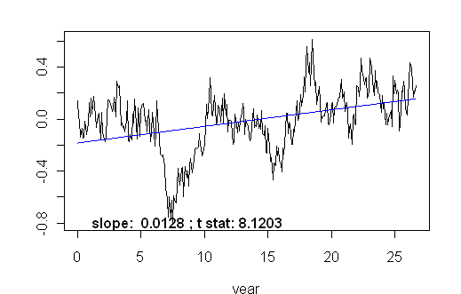 You can check the autocorrelation of a time series. If you get AR1 coefficients over 0.9 (probably 0.8), then you’re in a red zone and will need to adjust t-statistics. This is one issue where I’m going with these multproxy studies. At best, they do a goofy confidence interval calculation assigning confidence intervals of 2 standard deviations. This methodology is based on the fact that the 95% critical t-statistic is 1.96 – hence the 95% confidence interval. If the true t-statistic is 5 or 8 (as seems quite possible to me) and something that I’m trying to show, then the honest confidence interval of these studies is less than natural climate variation – which is certainly my view of them.