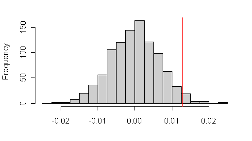 John Hunter has posted up some examples arguing the merits of OLS trend statistics. My take on the difference in approaches is that my concern is directed towards false positives, while John’s is directed towards false negatives. Both are valid issues. I think that the resolution of the points of view comes through accurately describing "confidence intervals" . I’ll come back to some of these issues later. Without commenting in detail on these examples, for now, I’d like to present some simulation data from ARMA (ar=0.92, ma= -0.32, innovation sd=0.11) walks as generated above (1000 examples). I fitted an OLS trend to each one. Figure 3 below shows the distribution of slope coefficients. The OLS trend of the satellite series (0.0128 deg/year) is at the 97th percentile for draws generated from 0 trend. This graphic also provides information on likelihoods with other trends. For example, let’s suppose that the "true" trend was 0.05 deg C/decade rather than 0 deg/decade: this would shove the graphic to the right with respect to the red line and make it about the 64th percentile with a lower "true trend". (Equally the observations could result from an ARMA(1,1) process with a larger trend than the OLS trend.