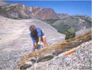 A volcanic eruption of the Glass Creek vent (Inyo Craters chain, eastern Sierra Nevada) during medieval times buried forests in the adjacent region under several meters of tephra. Large, mostly downed, dead trees on nearby Whitewing Mtn (3052m) and San Joaquin Ridge (3105m) appear to have been killed by the eruption and preserved in arid, cold environments; tentative radiocarbon analysis (Univ AZ, Lab of Tree Ring Research, 1980) gave dates in the eruption era. The presence of these stems suggests a tall forest existed at the time the trees were alive. Conditions at this time were warm with two 150-200 year dry periods between AD 900-1350 in the Sierra Nevada (Stine 1994). The dead stems contrast with current conditions of these habitats, which are treeless or have only occasional krummholz whitebark pine. Live forests of whitebark pine downslope suggest cycles of shifting treeline in more recent centuries, during the cool centuries known as the Little Ice Age. No previous studies have examined the paleoecological, climatic, or eruptive-sequence implications of the downed logs or downslope contemporary forests….Medieval-age (AD 900-1350) forest composition, structure, and growth on summits were typical of forests currently 300-500m lower, suggesting an effectively warmer climate during medieval times