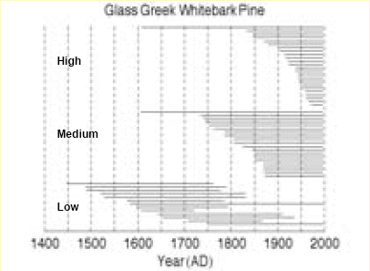 Figure 3. Left: Species identified from summit dead wood (currently krummholz P. albicaulis, rarely P. flexilis): Pinus albicaulis (37), P. monticola (20), P. flexilis (7), P. contorta (7), P. jeffreyi (6), P. lambertiana (2) (spp currently exotic east of crest), Tsuga mertensiana (1). Right: Date Ranges of Whitebark Pine Downslope of Whitewing Mtn: 1. Upper forest border (2900m) live whitebark pine invading current barren uplands. 2. Mid-slope (2800m) live whitebark pine in current western white pine, whitebark pine, and red fir forests. 3. Lower-elevation (2700m) dead whitebark pine stems in current lodgepole pine and red fir (Abies magnifica) forests.