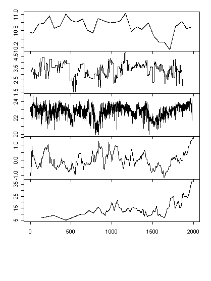 Before discussing Lauritzen, in passing, series #1 ends in 1966 with a downtick in my replication (there is no downtick in the Moberg version). I’ll check on this later. You will notice that this series (#1), as well as #11, is denominated in %, rather than deg C and has an obviously nonlinear relationship to the other series (as does #11). Nevertheless, it is blended with the other series in a type of weighted averaging (through wavelet methods.) I discussed series #11 previously as it is a very peculiar indicator for global warming: it measures cold water plankton and as a direct measure of SST would be turned upside-down. The hypothesis is that cold-water plankton offshore Oman shows upwelling of cold water due to strong monsoons and is thus an indicator of global warming elsewhere. This may be – but the ostensible reason for including the proxy was not as a teleconnection, but because local proxies were scarce. So it’s a strange proxy.