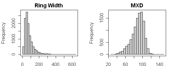 First (and this is not shown by Esper) is a simple histogram of RWM and MXD measurements. Obviously both distributions are skewed. It’s actually a somwhat interesting problem to think about what sort of distribution of temperatures and distribution of age responses would combine to yield final distributions like this.
