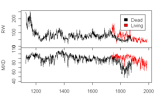 The top panel of Esper’s Figure 3 shows time series for RW and MXD as follows (the figure as it stands is hard to tell between living and dead):