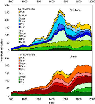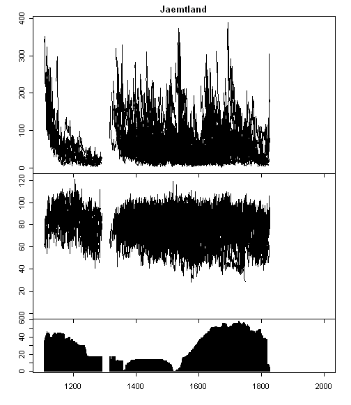 Next, here is a plot for Jeamtland in the same format as Figure 3 in Esper’s discussion of Gotland. When this plot is made on line, you can see individual trees starting together in the upspikes. My impression is that the starts are very non-uniform and are bunched in presumably warmer cycles, sufficient to permit germination – which looks to be VERY VERY nonlinear. It is striking that the cores for this dataset do not come further forward than the early 19th century – I don’t know the reason – and that there is a gap in the early portion. I have no idea how they crossdated the disconnected trees or whether this is simply floating. Esper et al [2002] does not give a publication citaiton for Jaemtland; it merely expressed thanks to the originating author. I’ll try to track down some further information on this site