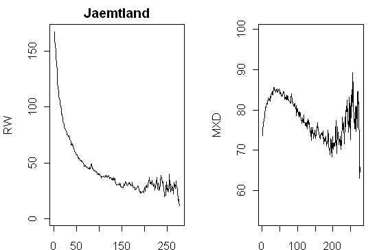 The following grass-plot shows both cumulative RW and "cumulative MXD". I realize that "cumulative MXD" doesn’t make a whole lot of sense as a concept, but it enables a plot that, to me, is more informative than Esper’s format, or, at least, provides an alternative view of the data. You can see that the RW information visually has more "low frequency" information than the MXD plots. Another thing here: the traditional viewpoint for curve standardization between cores is the theory that juvenile growth spurts need to be allowed for. I’ve experimented with fitting parameters in some other sets: in most individual curves, the juvenile growth spurt washes out by about 50-75 years. Surely in this graphic, what is more striking is the tailing off of growth in many trees as they start dying. This is a different phenomenon than juvenile growth; I haven’t thought through how to fit it, but it looks distinctive in this and other similar plots. (Note: "alpha" trees do not tail off at the same age as other trees, so it’s quite complicated modeling if you go to mixed effects.)