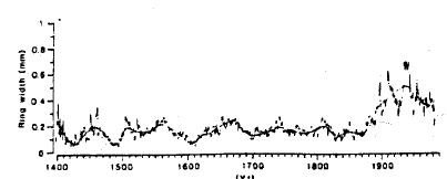Our reconstruction (especially the cold 9th century, the Medieval Warmth, the sharp climatic reversal centered on AD1150, the cold 13th and 14th centuries and the warmer 15th and 16th centuries) also agrees with the pattern of summer temperature deduced from tree ring data in Fennoscandia [Briffa et al 1992] and the temperature reconstruction from oxygen isotopes in the Greenland ice sheet [Dansgaard et al 1975]. This suggests similar climatic trends over the North Atlantic region. However our data contrast with tree ring records from western North America [Lamarche 1974, Graumlich 1993] and the Urals [Briffa et a; 1995], suggesting prolonged warmth and associated drought between AD1000 and 1400. These results are additional evidence questioning the existence of a globally synchronous Medieval Warm Period.