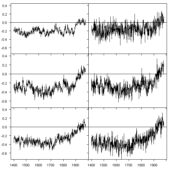 On the left is the simulated PC1 fitted against NH temperature (as used in our first GRL calculations) and on the right is the NH temperature resulting from the same PC1 combined with 21 white noise proxy series. It is obvious that the shape and scale of the two series are identical. The biggest observable difference is the increased variance on the right hand side. I hadn’t done graphs in this form at the time when our Huybers response was finalized a few weeks ago, but I find them extremely instructive. While the MBH98 re-scaling operation seems on the surface to be a simple re-scaling of the predictor as criticized in von Storch [1999], the net result is more like an addition of white noise. I’ve always regarded these proxies as operating like noise, but it is remarkable to see exactly what they do in this before-and-after diagram.
