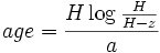 Glaciers become increasingly compressed with age. The usual equation linking the total thickness of the glacier H and the annual accumulation a to the age at a given depth z is as follows: