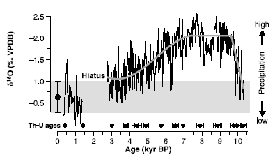 In southern Oman the abrupt onset and rapid increase in monsoon precipitation between 10.3 and 9.6 ky B.P. indicate a rapid northward migration of the ITCZ and are in agreement with Arabian Sea upwelling records (4, 5) and regional lake level (3), ice core (14), and speleothem records (6, 12). …After ~8 ky B.P., the gradual long-term decrease in monsoon precipitation (as inferred by the shift toward modern 18O values) indicates a continuous southward migration of the mean summer ITCZ and a gradual weakening of monsoon intensity…