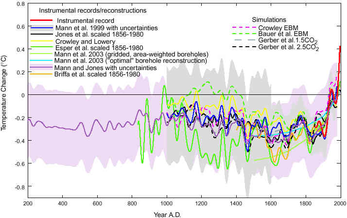 Yesterday I waded through a demonstration of a fairly egregious splice of the instrumental record into Crowley’s reconstruction as used in Crowley [2000]. Today I consider the use of the Crowley reconstruction in spaghetti graphs and, in particular, Mann’s statement at realclimate that: