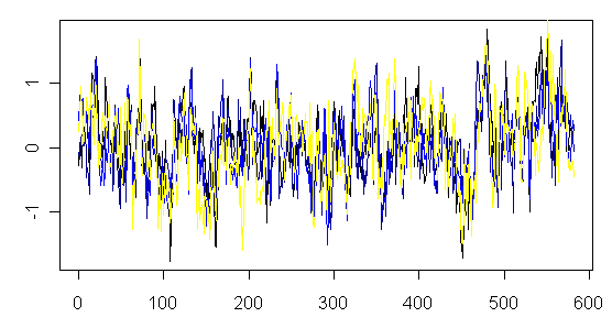 I did a quick simulation using of 12 series with AR1 coefficient 0.8 and then calculated multiproxy averages using the distribution of the above table. (There are 4 other series in MBH, which are very lightly weighted. I’ve not modeled this here, but will re-visit on some other occasion. Because of their light weighting, their effect is negligible.) The mean interseries correlation was 0.66.