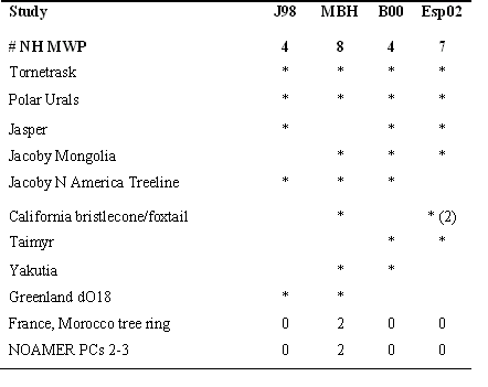 However, many of the proxy series between these reconstruction are shared, as summarized in the following Table. Esper et al. discuss the fact that 2 series are in common, but do not consider or report on the additional impact of the 4 series shared by 3 reconstructions or the 4 series shared by 2 reconstructions.