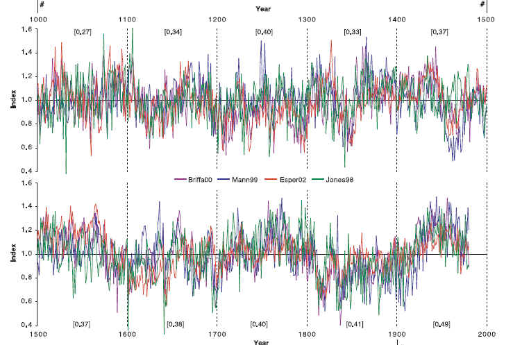 Esper et al [2004], posted up here, removed low-frequency from MBH99, Briffa et al [2000], Jones et al [1998] and Esper et al [2002] and pointed out a seeming coherence, reporting an average interseries correlation of 0.42.