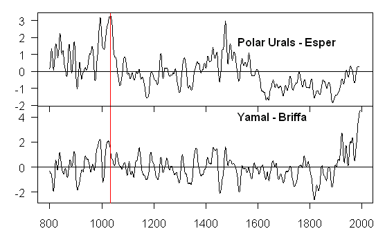 It is also fascinating to see what happens to 1032 – the “coldest” year of the millennium according to Briffa et al [1995] and the “cold” early 11th century (about which I’ve written a lot). The old Polar Urals series, which was so important in “proving” that the MWP had no patterns. Here, 1032 is in the midst of one of the warmest intervals of the millennium – both in the Esper version and in Briffa’s reprocessing of Yamal. I wonder if Briffa has any plans to send an update to Nature or to anyone else.