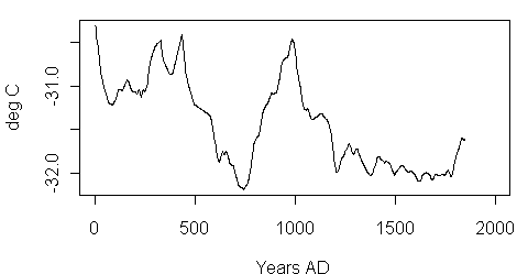 A further editorial aside: data is archived at WDCP for Alley [2000] here , which provides as an additional reference Cuffey and Clow [1997]. (I’ve consulted Cuffey and Clow [1997] but haven’t consulted Cuffey et al 1995 yet). Here’s the latter portion of Cuffey’s reconstruction as archived, which at least also shows the same feature of medieval-modern levels as the graphic presented by Alley. (Dates in BP converted to 1950. GISP results come much later than shown in the data archived at this file, perhaps due to the smoothing by Alley [2000]. The data in Alley [2000] goes back to 43000BP, the main purpose of the reconstruction being to illustrate the difference between LGM and Holocene results and the MWP illustration here is incidental to the original article.) Obviously it shows a pronounced MWP peaking at the exact point of Viking exploration. Cuffey’s reconstruction is not used in any Hockey Team reconstructions. I’m going to post up some remarkably different temperature histories from Greenland, showing the curious spaghetti that may exist in even one locale.