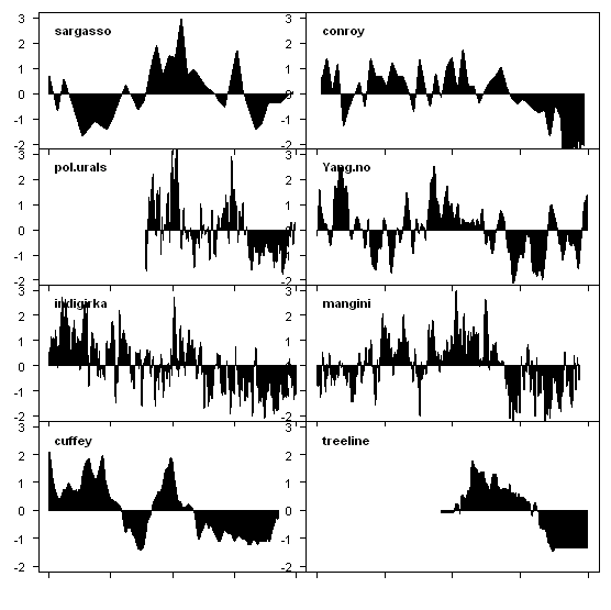 6 of 8 selected series use data from canonical multiproxy studies. The Sargasso Sea, Conroy Lake and Indigirka series are used in Moberg (Sargasso also in Crowley). (Moberg only uses the high-frequency tree ring information from Indigirka, but obviously low-frequency tree ring information is regularly used in Hockey Team studies.) I’ve used the updated Polar Urals ring width series from Esper et al 2002. I’ve used a subset of the Yang composite – the subset without Thompson’s Dunde and Guliya ice cores, but the subset is the majority of the data. I’ve used Cuffey’s Greenland series, as archived by Alley [2000]. I’ve used Mangini’s speleothem data. I’ve used the Polar Urals treeline data digitized from Briffa et al [1996]. This is a little repetitive (but Hockey Team studies sometimes use two bristlecone/foxtail sites e.g. Esper, Osborn and Briffa). I don’t have a digitized bristlecone treeline series, but it would be similar.