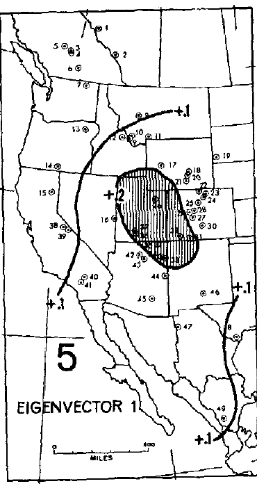 Lamarche and Fritts Figure 1 – Pattern A – middle panel showing contoured eigenvector coefficients for first eigenvector 1931-1962.