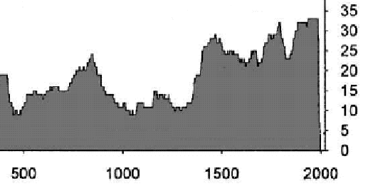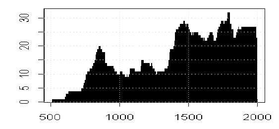 Both Esper and OB cite Naurzbaev as the source of the data. (Naurzbaev’s articles are ones that I’ve recommended as good ones.) Naurzbaev et al [Holocene 2002] have a graphic showing the count of ring width measurements by year; so I plotted up the corresponding information from Esper’s measurement file with curious results.