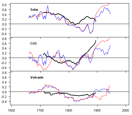 Figure 1 : Jean S: solid – emulation; dash-dot lines from MBH98. Blue: CO2, green: solar, red: volcanic. There is no moving averages (smoothing) used here. Jean S: "Those are simply partial correlation coefficients in moving windows plotted such that the year corresponds to center of the window." SM – I think that Jean S and I are using "partial correlation coefficient" in different ways. Since our replication graphs are the same, underneath the algebra and terminology, we’re doing the same thing. I’ve haven’t tried to reconcile the terminology yet.