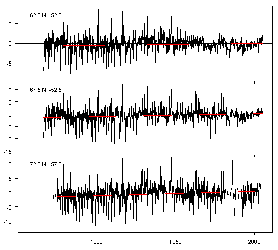 A couple of features catch my eye. First, there isn’t a big trend on either coast. Second, the 1930s were warmer than the present, a point we’ve heard on many occasions. Third, the amplitudes of the east coast gridcells is lesas than the west coast gridcells. Fourth, there is little change in upspikes; in "warm" periods, what you see is more an absence of downspikes, which characterize the late 19th century. Any slight trend in a couple of gridcells is dependent on these 19th century downspikes. I’m not drawing any conclusions from it, but there is no obvious "Arctic amplification" here; in fact, there is none. So if one of the fingerprints is Arctic amplification, CSI could find no fingerprints at this crime scene. The Hockey Team must have wiped off the prints and "moved on".