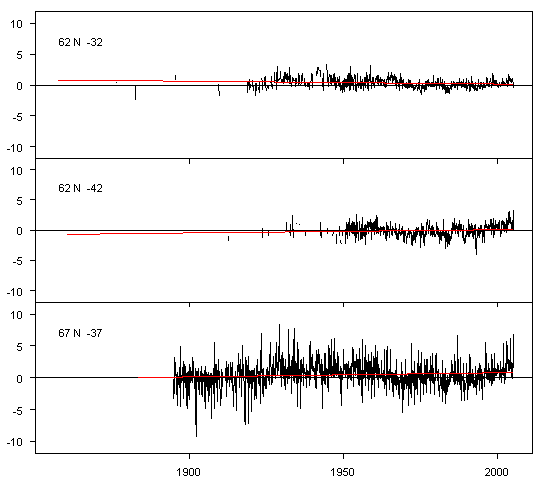 Figure 2. HadCRU2 temperature anomalies for three east coast Greenland gridcells